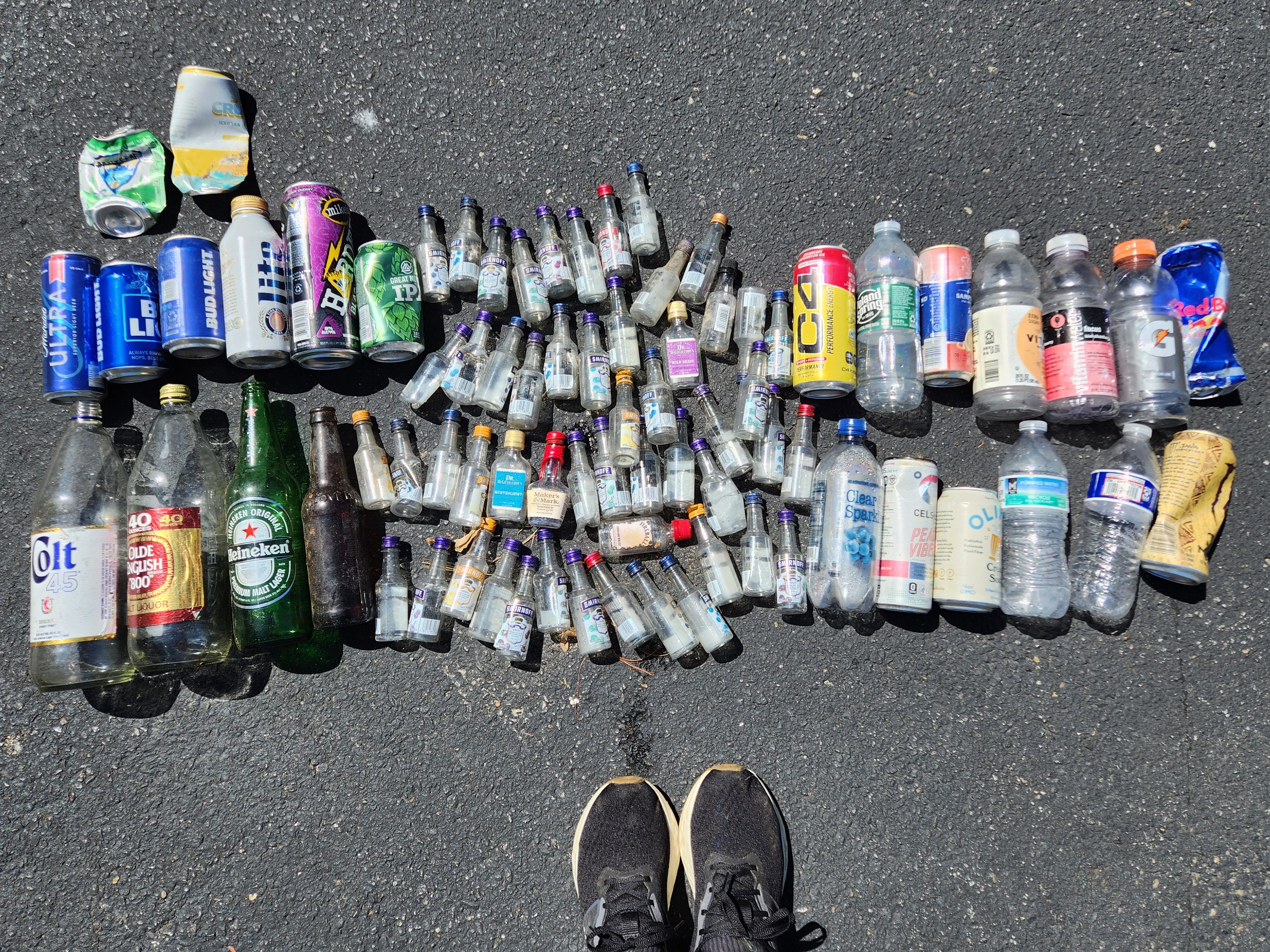 This year, I decided that since I usually see lots of bottles and cans, I would bring an extra bag for recyclables, and bring those home to put into my household recycling cart. In one hour here’s what I brought back: